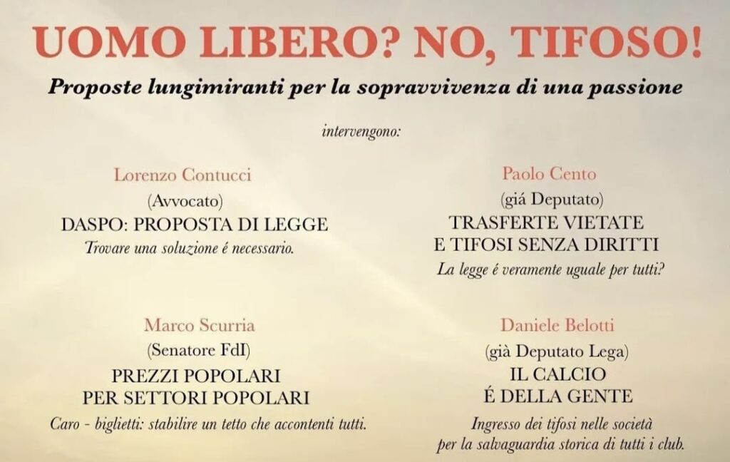 L’incontro “Uomo libero? No, tifoso – Proposte lungimiranti per la sopravvivenza di una passione” vedrà la partecipazione dell’avvocato Lorenzo Contucci, del senatore di Fratelli d’Italia Marco Scurria e degli ex deputati Paolo Cento e Daniele Belotti. Un importante incontro politicamente trasversale quindi che si terrò alle ore 17.00 presso il Teatro delle Muse in Via Forlì, 43 a Roma.