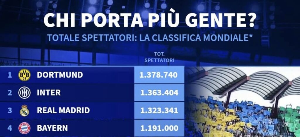 Nel 2025/26, infatti sono 1.378.740 gli spettatori che hanno seguito il BvB. La Beneamata – evidentemente di nome e di fatto – segue a ruota a quota 1.363.404. Sul podio sale anche il Real Madrid (1.323.341).