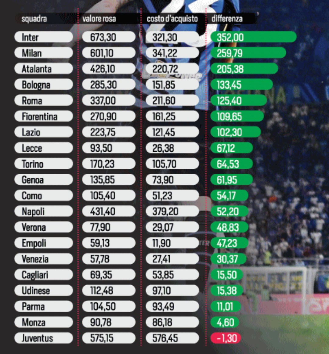 Questa crescita ha portato a una differenza di 352 milioni tra il costo d’acquisto (321,30) e l’attuale valore (673,30). La rosa vale il doppio dei soldi che sono serviti a costruirla. Seguono, poi, il Milan con un differenziale di 259,79 e l’Atalnta (202,38). Fanalino di coda la Juventus, che ha speso ben 576,45 milioni per una squadra che ne vale 575,15: unica squadra in negativo.