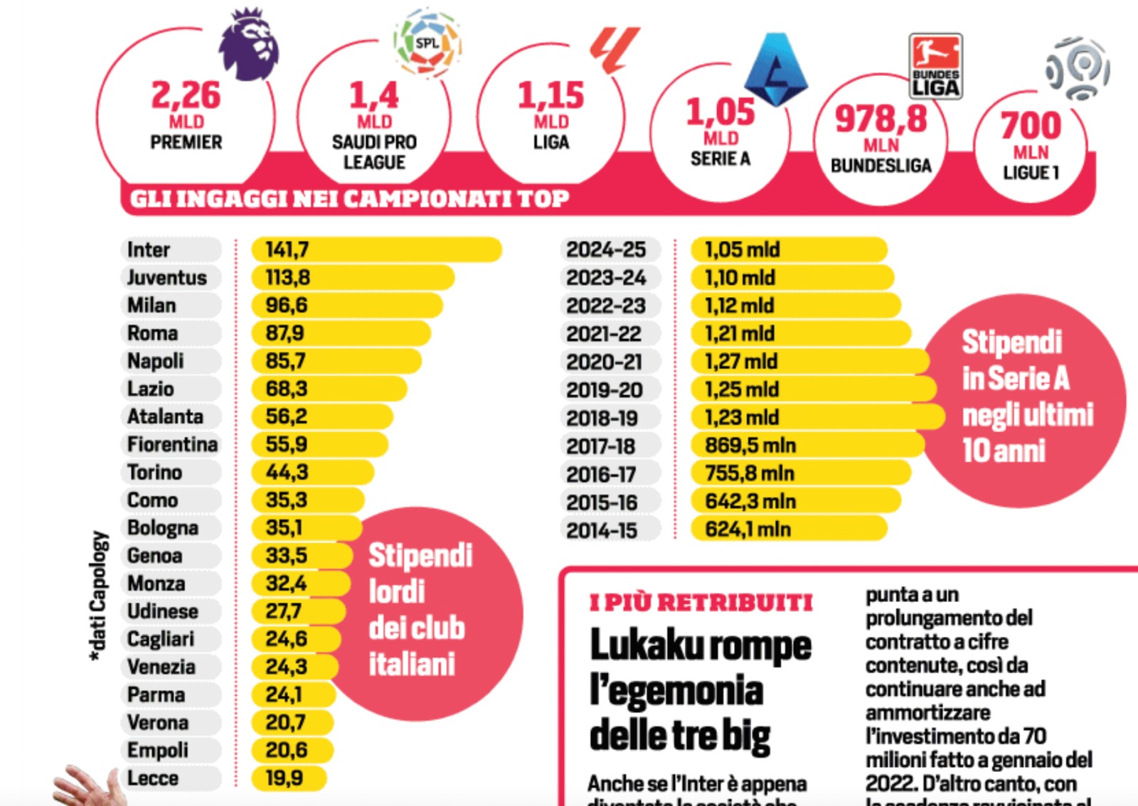 Dopo il distacco leggero di un anno fa, con la Juventus a 125,6 e l’Inter a 123,6, ecco il sorpasso. A livello generale, invece, la Serie A è a quota 1,05 miliardi di stipendi, dietro Liga (1,15), Saudi League (1,4) e Premier League, che domina con 2,26 miliardi.