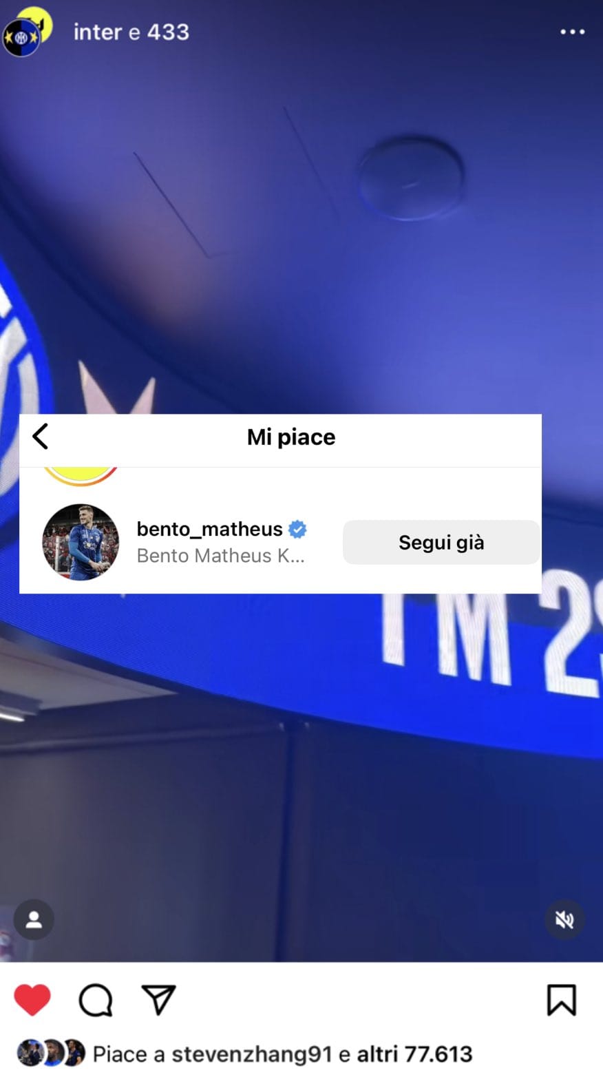 Infatti, nell’ultimo post pubblicato dall’Inter su Instagram – in collaborazione con la pagina 433 – non manca il like di Bento, che comunque continua a sognare di arrivare a Milano, sebbene non ci sia ancora una trattativa vera e propria tra i due club.